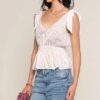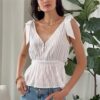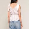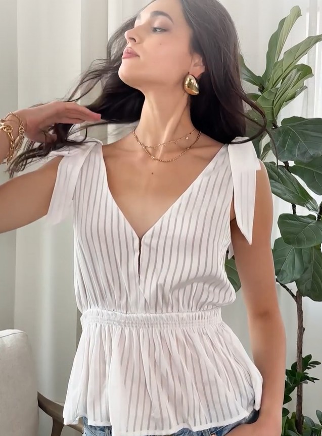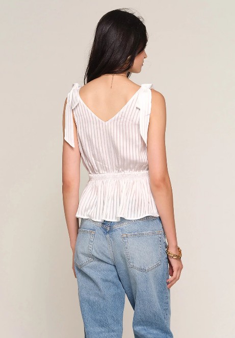 The Loulou Top is made from a pinstripe satin. It has a self ties at the shoulders and an elastic waist.