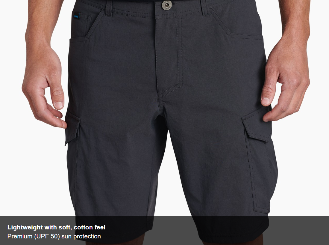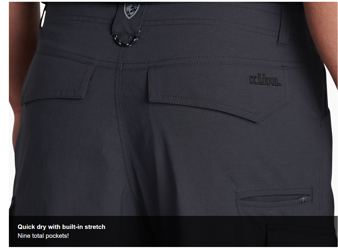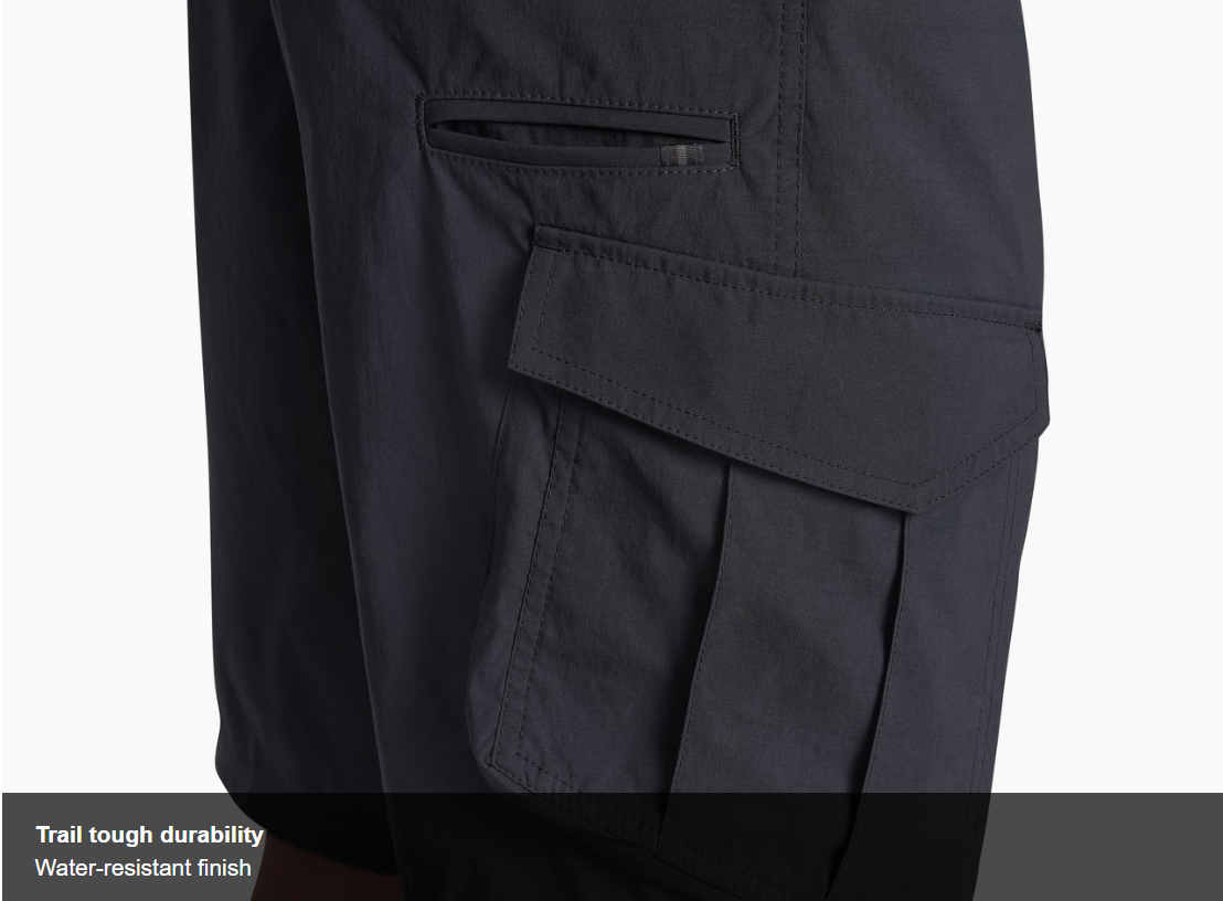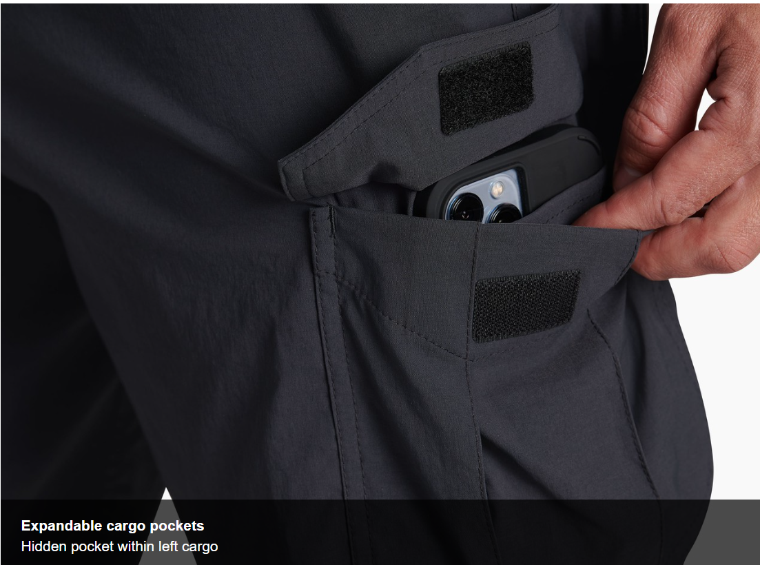 - Nine pockets: two front hand, one coin, two side cargo with velcro closure, hidden pocket inside left cargo, two back with velcro closure, drop in cell phone pocket.