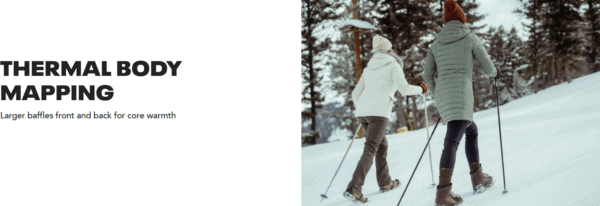 • Thermal body-mapped design with large baffles at body front and back for core warmth and smaller baffles at side body and sleeves for less bulk