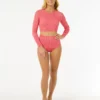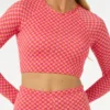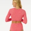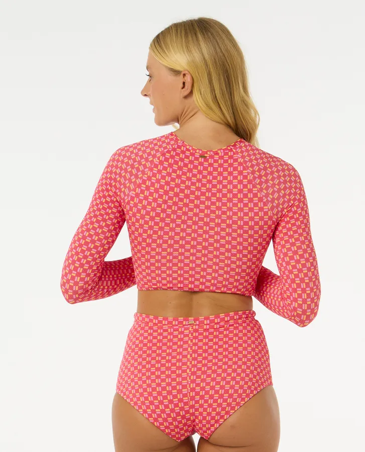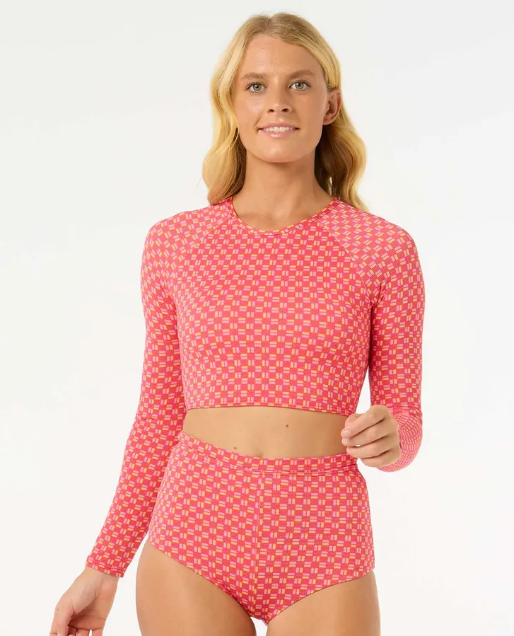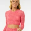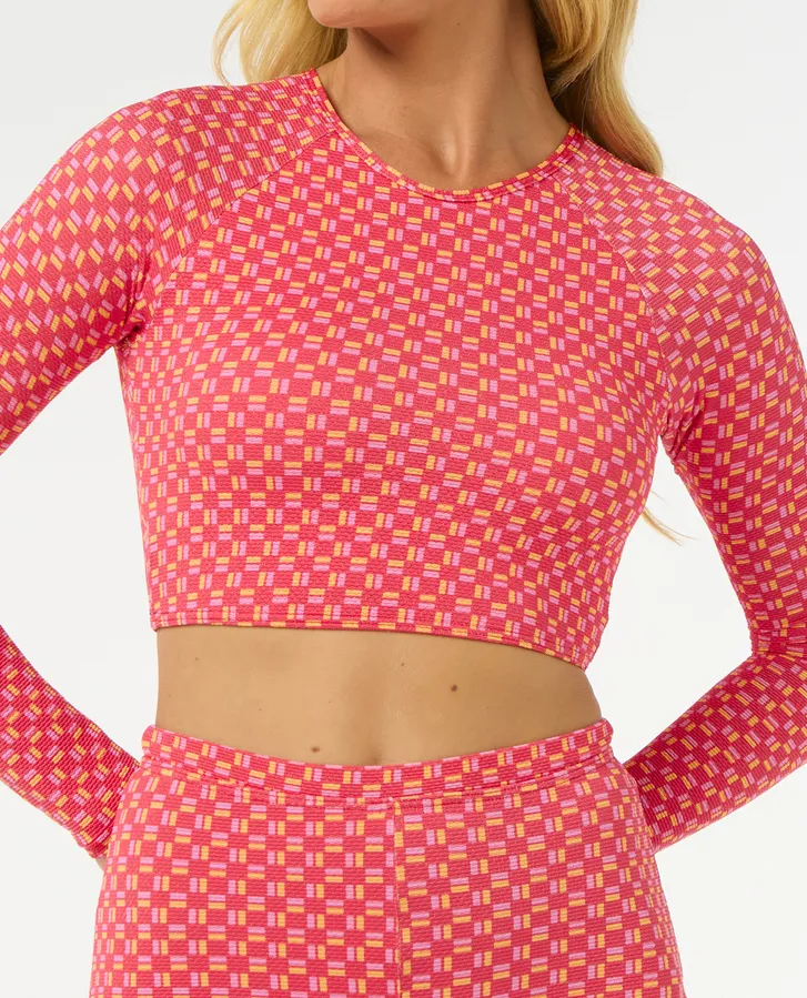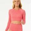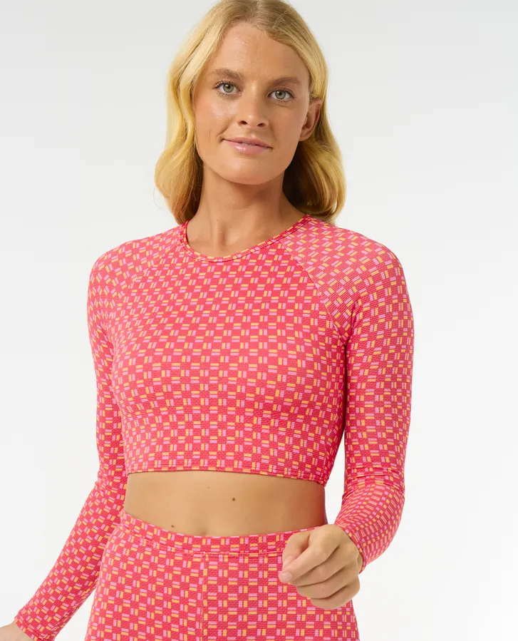 This long-sleeve cropped rash guard is crafted from Lurex Pique fabric and offers an all-over yardage print. It includes removable padding, is fully lined for comfort, and features a metal logo trim for a polished look.
