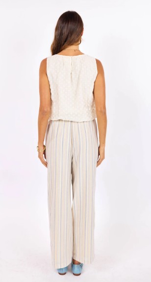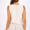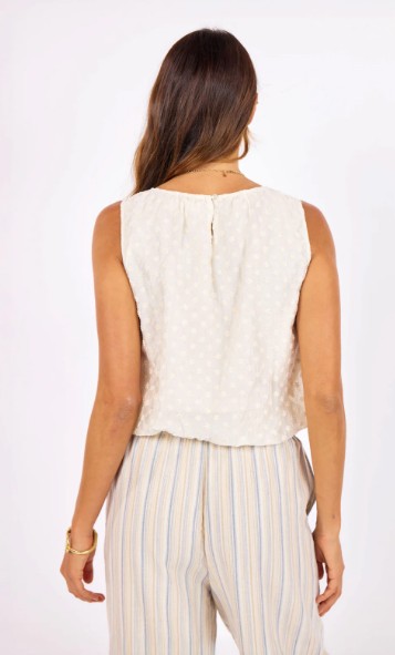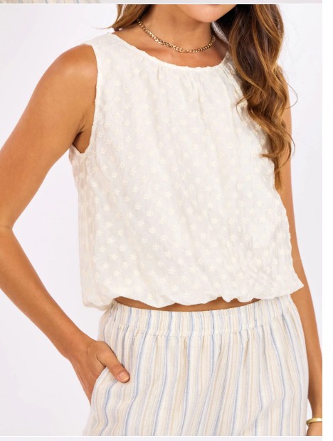 The Soul Searching Bubble Top is a sleeveless, round-neck top crafted from textured fabric with tonal floral embroidery. It features a relaxed silhouette and an elasticized bubble hem that creates a voluminous, cropped fit.