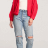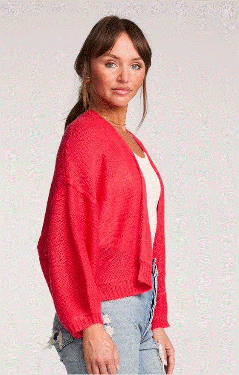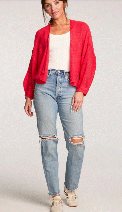 The Aden Vintage Red Sweater is a timeless classic cardigan featuring a cropped silhouette and boxy fit.