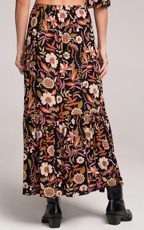 The Carli Maxi Skirt features a full, tiered design that flares into a dramatic wide bell silhouette.