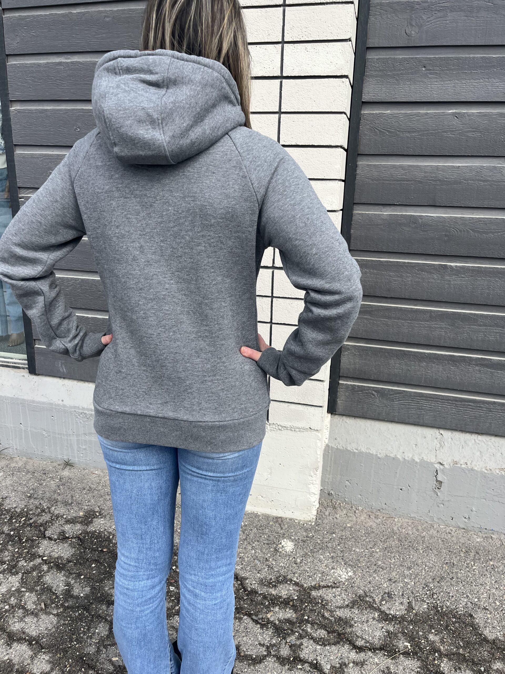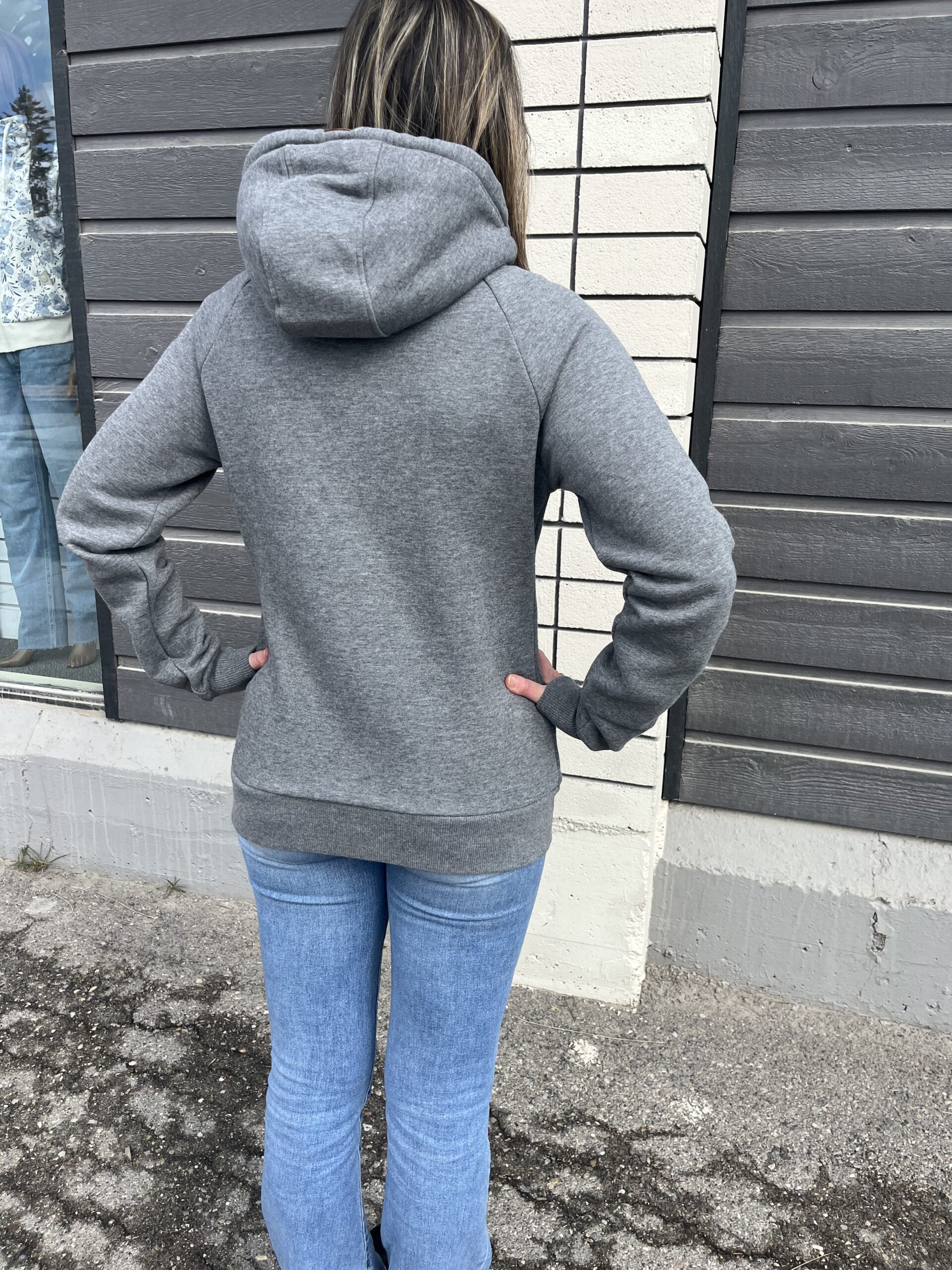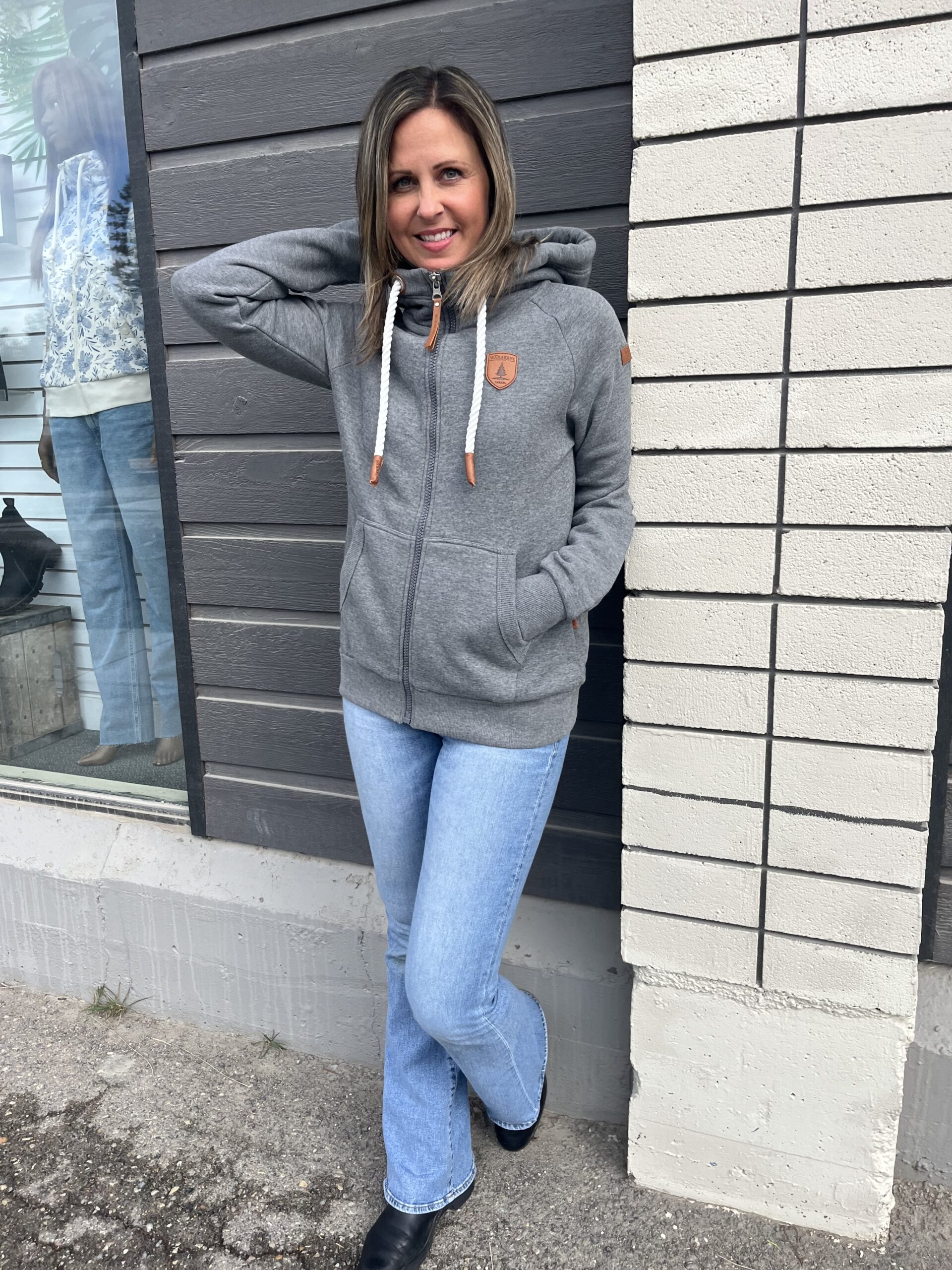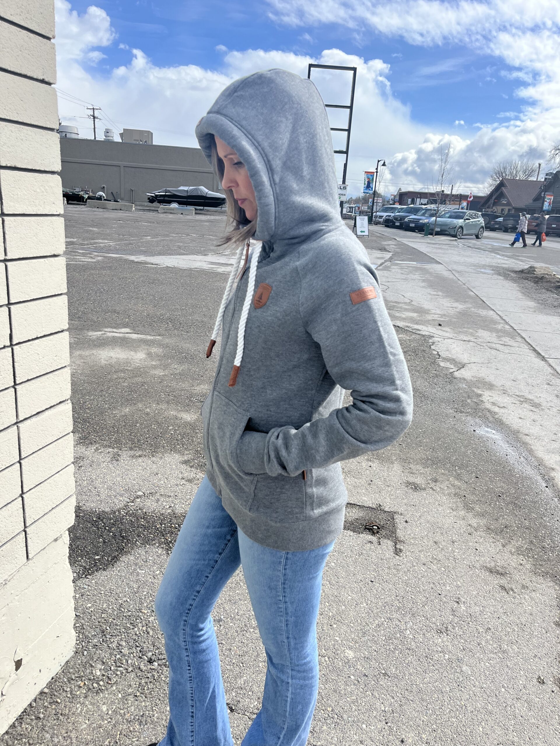 Cowl neck hood with adjustable rope drawstrings and vegan leather caps