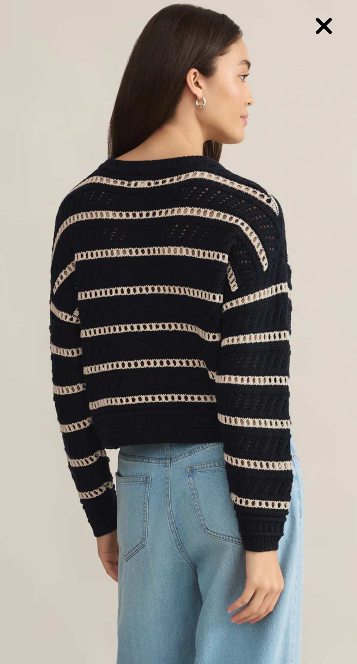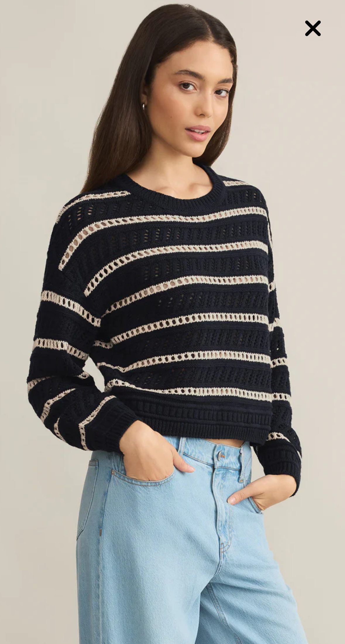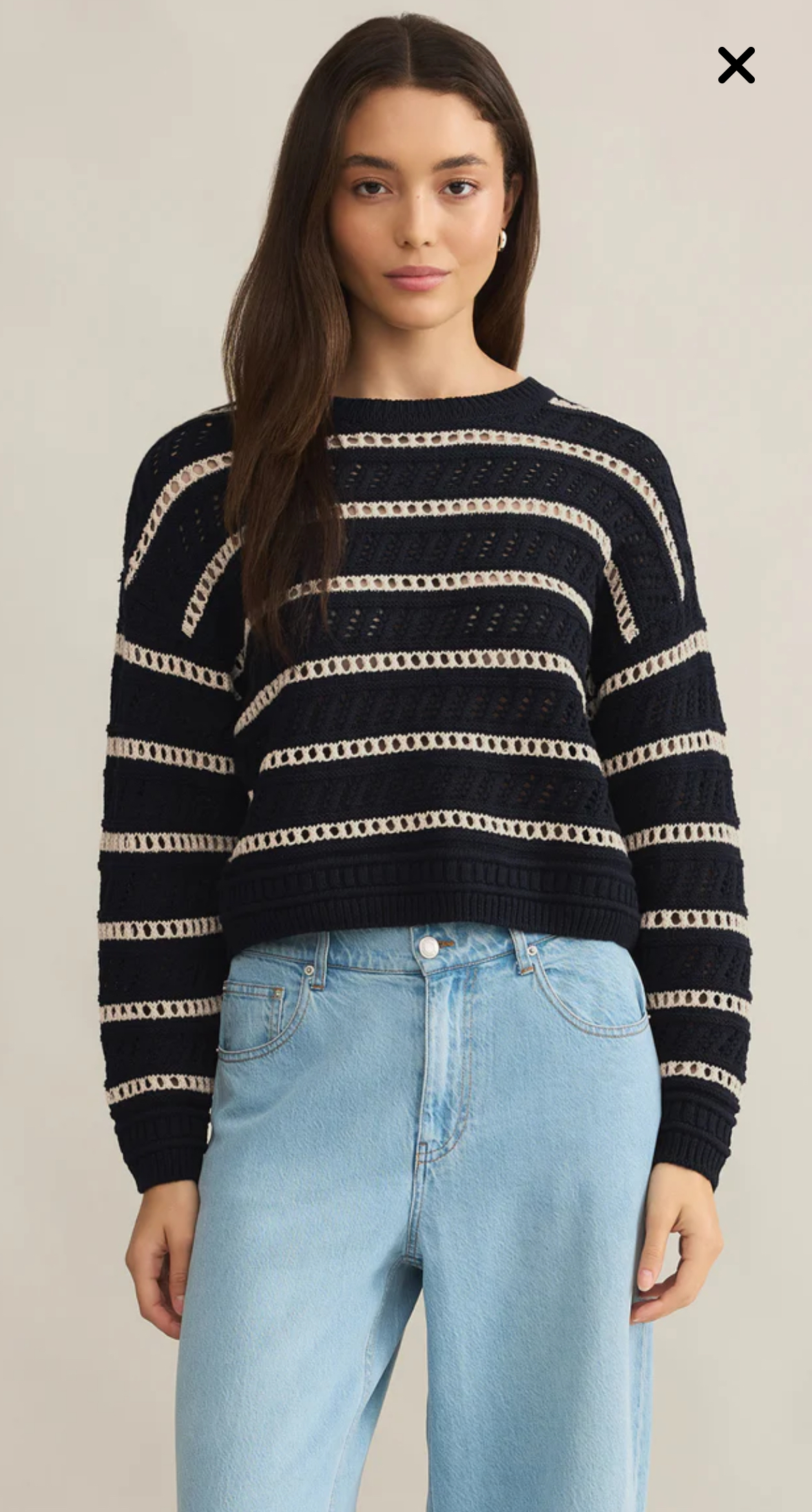 This midweight crochet sweater brings a relaxed vibe with its striped design and drapey fit. Finished with long sleeves and a crewneck, it’s the perfect cozy-chic layer for any season.